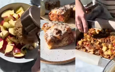 Kdybychom měli popsat dokonalý podzimní koláč, byla by to právě tato kombinace jablek, skořice a karamelové chuti másla. Je totiž výsledkem spojení dvou tradičních receptů - klasického jablečného fritters (tedy smaženého pečiva s kousky jablek) a vláčného koláče s drobenkou.
