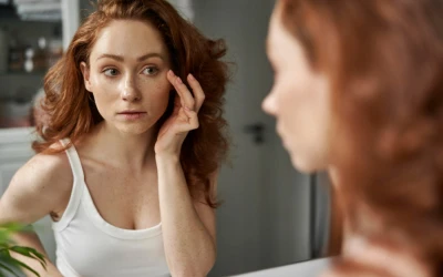 Při dehydrované pleti si v zrcadle všimnete jiný jev: pleť působí unaveně, mdle a na povrchu může vypadat mírně zvlněná, jakoby měla drobné linky navíc. Dehydratace zvýrazní mimické vrásky, které běžně nevidíte, a pleť při natažení prsty ztrácí hladkost. Může se přitom lesknout, zejména v T-zóně. Tento paradox – lesk zvenku, ale napětí zevnitř – je jeden z nejsilnějších vizuálních signálů, že pokožce chybí voda, ne lipidy.