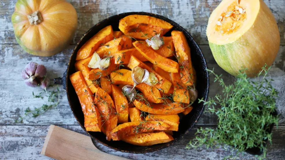 Máslovou dýni očistěte, nakrájejte na hranolky, promíchejte s olivovým olejem, tymiánem a špetkou soli. Pečte 15–18 minut na 190 °C, v polovině promíchejte. Výsledek? Zvenku křupavé, zevnitř jemné hranolky s přirozenou sladkostí – zdravé, barevné a děti je milují!
